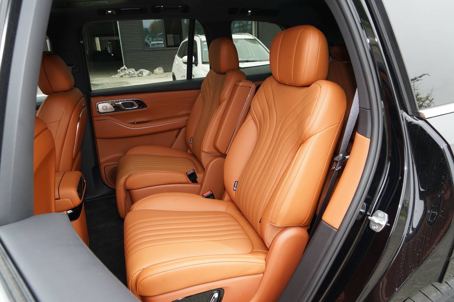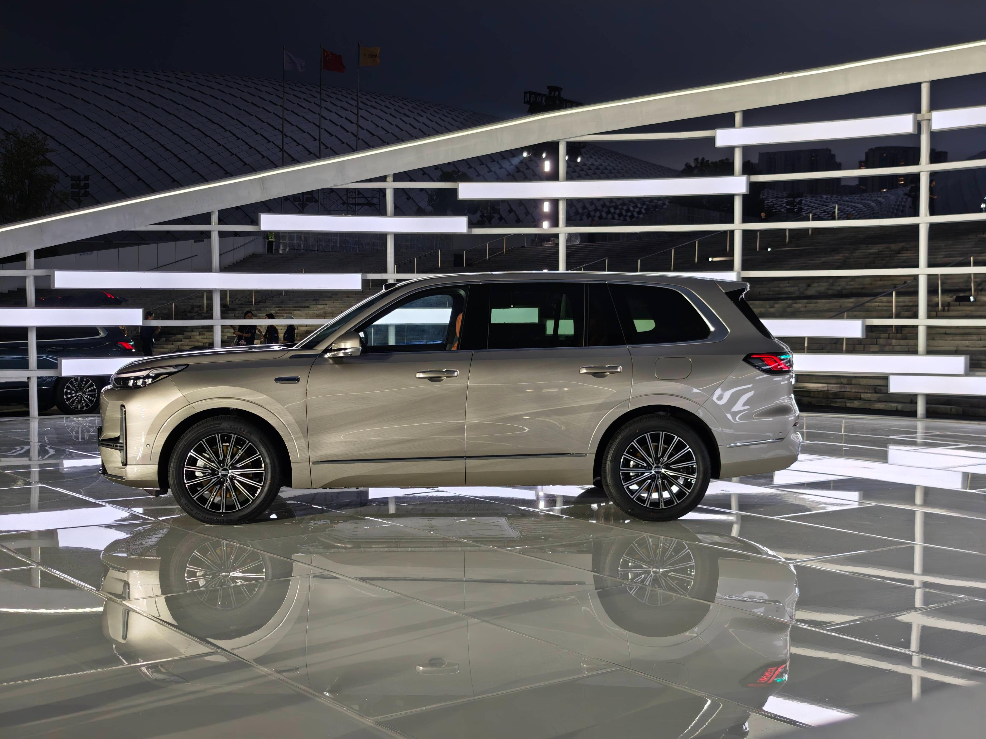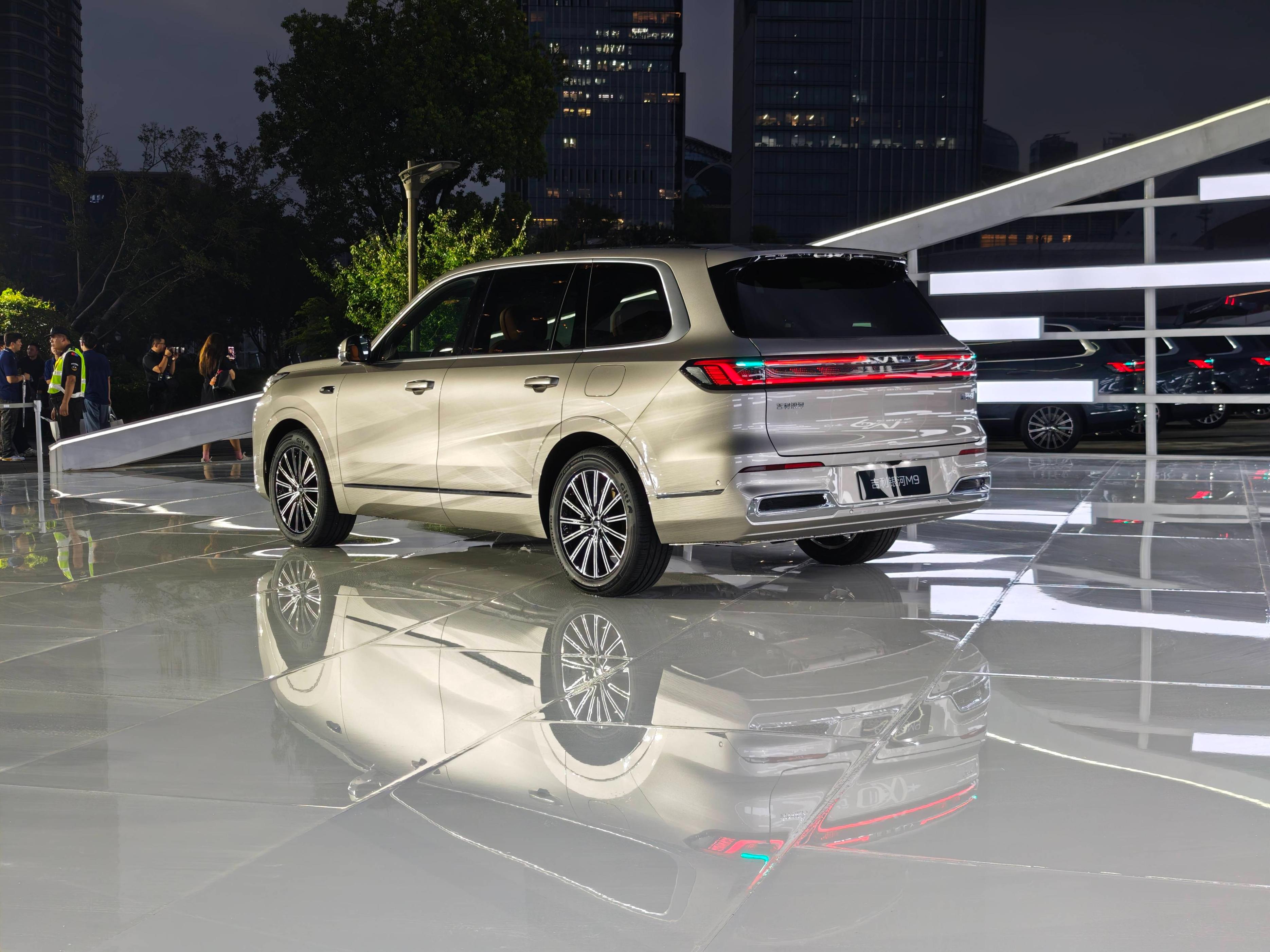 车身侧面延续了大型SUV的标准结构,车门边框以银色饰条点缀,搭配传统外拉式门把手和大尺寸密辐轮圈,营造出高级感。车尾部分,车顶扰流板与贯穿式尾灯组相呼应,尾灯面积较大,点亮后辨识度突出;后包围加入镀铬装饰,还勾勒出双边共两出的排气造型。
